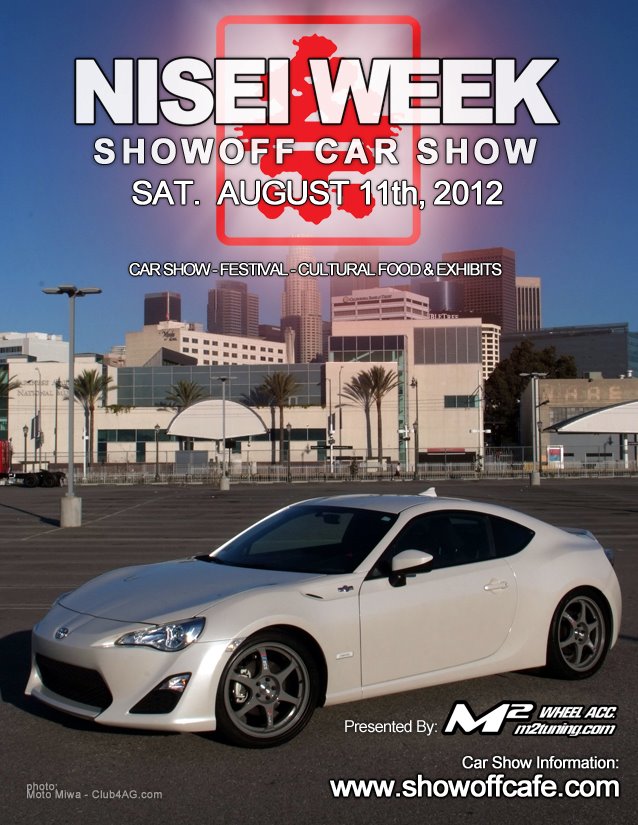 Originally called Showoff Jamboree in 99′, the 13th annual Nisei Week Car Show and festival has been in the fore front of the industry. The originator of the import car show since 1996. Nisei Showoff continues to push the boundaries and set the standards for import automotive tuning and lifestyles through out the world. Featured in this years flyer is Moto-San’s (founder of club4AG.com) brand new Scion FR-S sporting a very stylish SSR Type-C RS wheels.